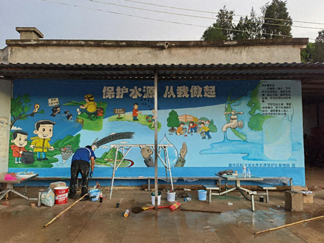 “请勿在水源区钓鱼”“划定并严守生态红线”……在艺术的加持下,手绘把曾经“灰头土脸”的一面墙改造成一幅美丽的画卷,成为了村里一道靓丽的风景线,格外引人注目。同时,水源保护手绘墙末尾的庄严的宣誓词也督促着当地群众成为水源保护的积极行动者。